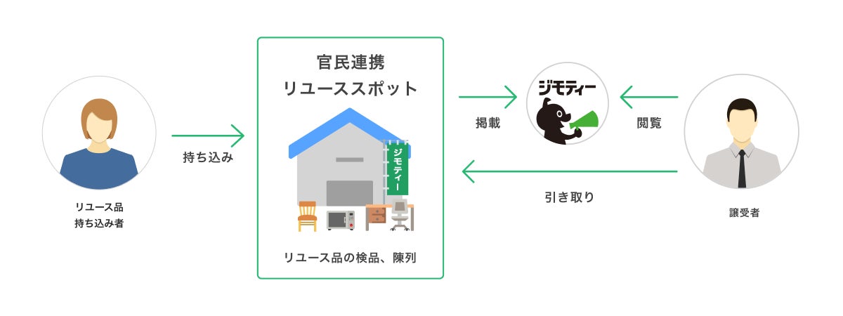 住民が不要となった再利用可能なモノを気軽に持ち込める場を設け、回収品をジモティーに出品するリアル拠点(以下、ジモティースポット)を運営します。ジモティーを通して必要とする近隣住民に譲渡できるスキームを地元の事業者や自治体と共同で構築しています。