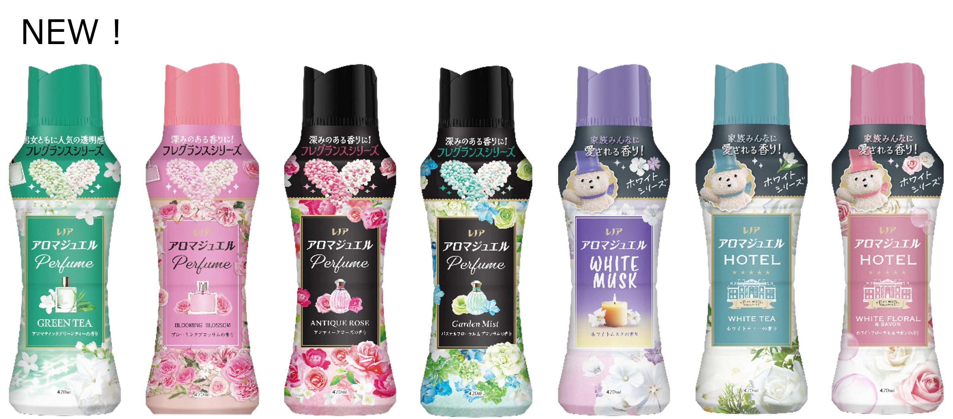 ホワイトシリーズ:「レノアアロマジュエル ホワイトムスクの香り」、「レノアアロマジュエル ホワイトティーの香り」、「レノアアロマジュエル ホワイトフローラル&サボンの香り」