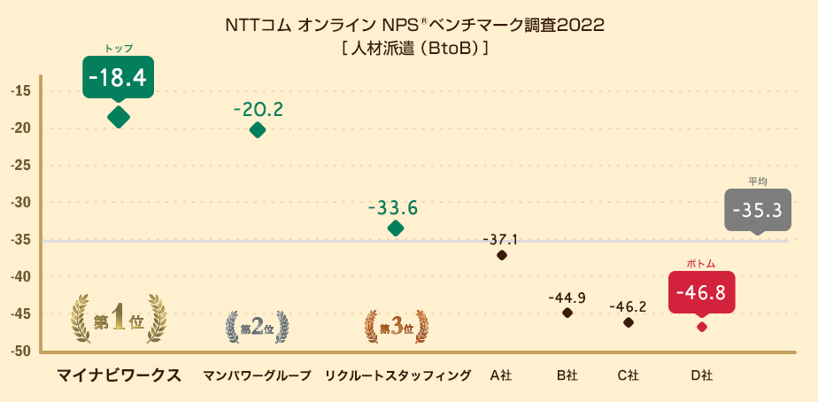対象の人材派遣会社7社のうち、NPS®のトップは昨年に引き続きマイナビワークス(-18.4ポイント)となりました。2位はマンパワーグループ(-20.2ポイント)、3位はリクルートスタッフィング(-33.6ポイント)となりました。トップ企業とボトム企業の差は28.4ポイント、7社のNPS®平均は-35.3ポイントとなりました。