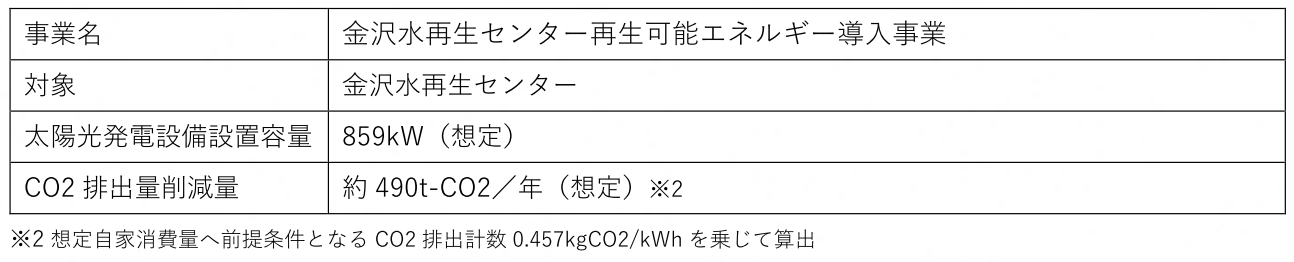 東急不動産は、金沢水再生センター内の設置対象となる敷地面積(約10,000㎡)を最大限利用した太陽光発電設備の導入(設備出力859kW)により、発電した電力を対象施設で全量自家消費できるようにします。これにより、対象施設においては、年間約490t-CO2の温室効果ガスの排出量を削減につながります。