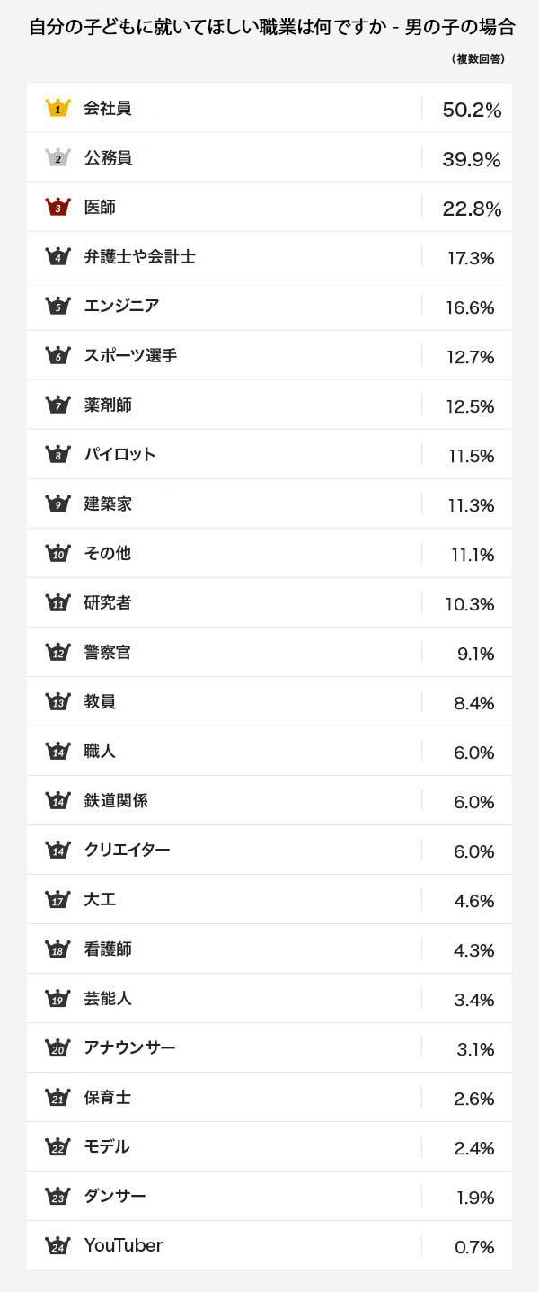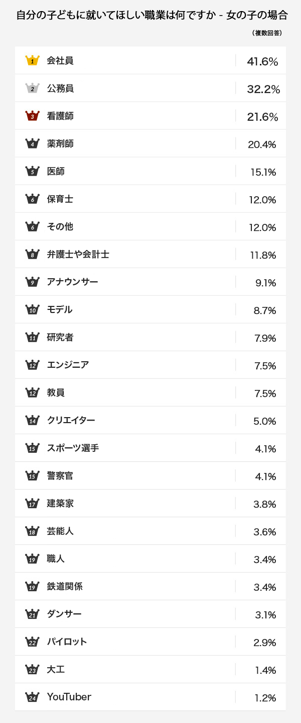 今回のアンケートは「自分の子どもに就いてほしい職業」です。「会社員」、「公務員」、「医師」、「エンジニア」、「スポーツ選手」、「弁護士や会計士」、「芸能人」、「教員」、「研究者」、「警察官」、「建築家」、「パイロット」、「大工」、「職人」、「看護師」、「薬剤師」、「保育士」、「鉄道関係」、「クリエイター」、「ダンサー」、「モデル」、「アナウンサー」、「YouTuber」、「その他」の24の選択肢の中から、複数回答で答えていただきました。