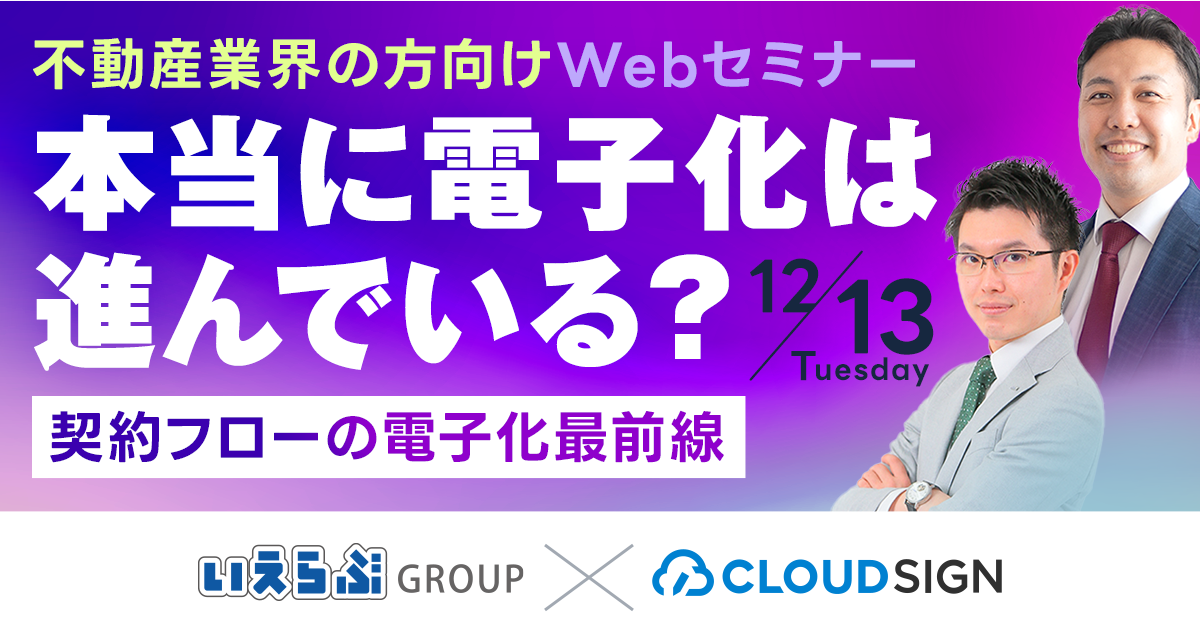 不動産テックに特化した業界垂直統合SaaS「いえらぶCLOUD」を提供する株式会社いえらぶGROUP(本社:東京都新宿区、代表者:岩名泰介、以下「いえらぶGROUP」)は弁護士ドットコム株式会社(本社:東京都港区、代表取締役社長:元榮太一郎、以下弁護士ドットコム)と合同で、電子契約を検討している不動産会社の担当者向けに「不動産業界の方向け|\本当に電子化は進んでいる?/契約フローの電子化最前線」と題したセミナーを開催します。