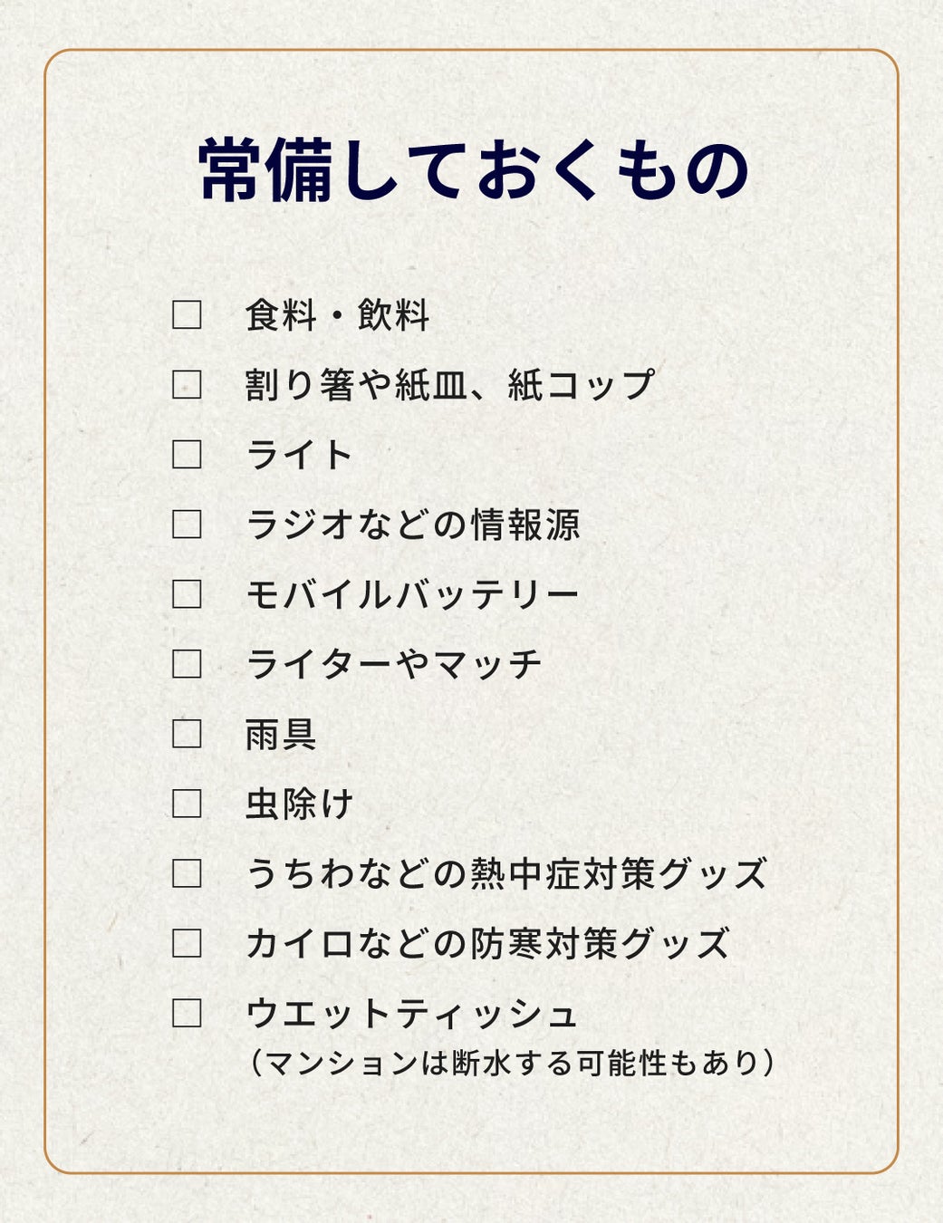 備蓄品は家族構成、避難手段なども考慮して選ぶことをおすすめします。