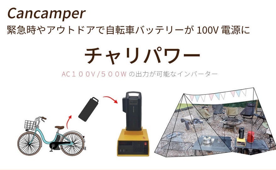 そこでおすすめしたいのが、電動アシスト自転車のバッテリーを使いながらAC100V/500Wを出力するキャンキャンパーの「チャリパワー(ivt2499)」です。