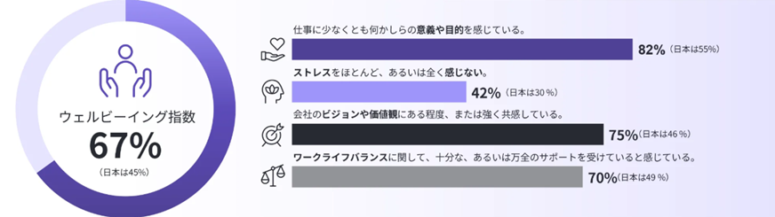 テーマ①ウェルビーイング指数:グローバル67%(前回調査±0) 日本45%(前回調査+2)