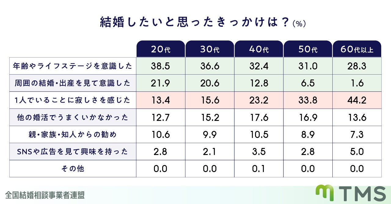 全国の1300店舗以上の結婚相談所が加盟し、成婚率の高いサービスを誇るTMS 全国結婚相談事業者連盟(https://www.nakoudonet.com/)は、現在結婚相談所で活動中の男女を対象に「結婚したいと思ったきっかけに関する意識調査」を実施しました。その結果、男女ともに「年齢やライフステージを意識した」が最も多い理由であることが分かりました。特に女性はこの理由を挙げた割合が高く、結婚を意識するタイミングにおけるライフプランの重要性がうかがえます。