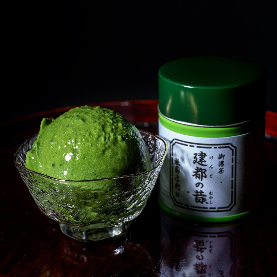 祇園辻利の最高峰抹茶「建都の昔」を贅沢に使用した手作りのアイスクリーム。茶師の技が生み出す重厚な旨味と余韻を感じさせる、究極の抹茶アイスクリームです。
