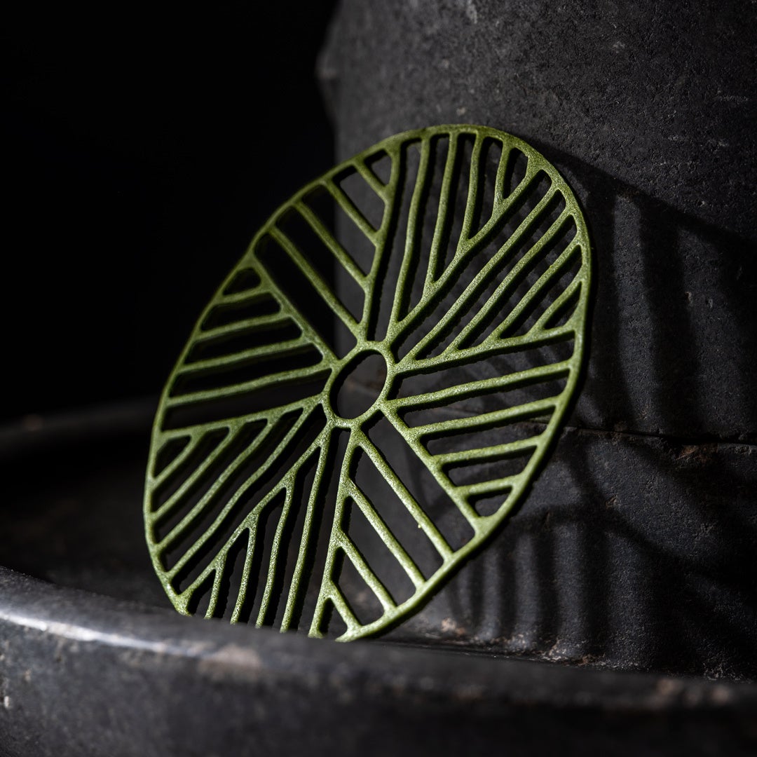 重厚感のある石臼模様を繊細な線で表現し濃いめの配合で作り上げた抹茶のラングドシャを店内で焼き上げました。食感のアクセントとなっています。