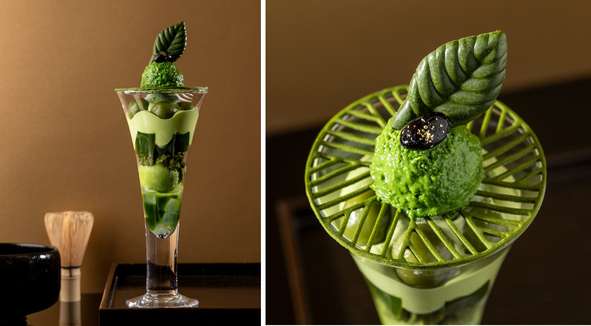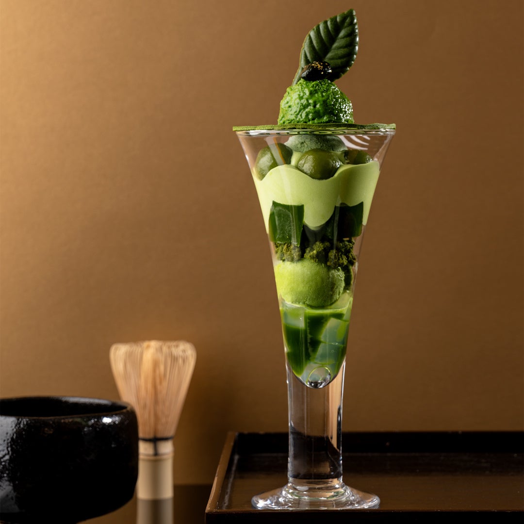 伝統の抹茶白玉やゼリー、エスプーマに加え、抹茶シュトロイゼルや蜜・寒天など、多彩な食感と風味を重ね、一つのグラスに抹茶の真髄を凝縮いたしました。