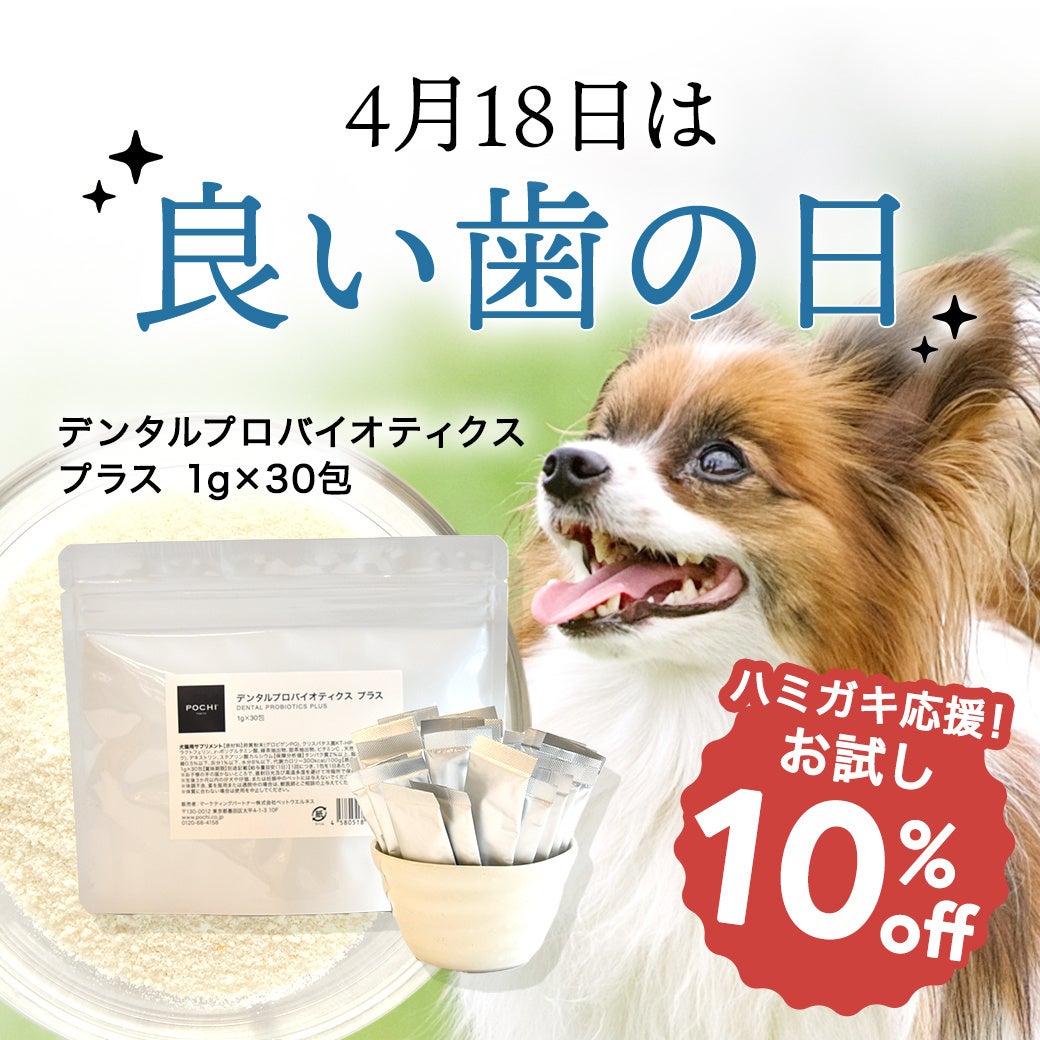 プレミアムドッグフードメーカー「POCHI」(運営:マーケティングパートナー株式会社、本社所在地:東京都新宿区、代表取締役社長:泰地正人、Tel:03-6772-8194、https://www.pochi.co.jp/)は、「良い歯の日(4月18日)」にちなんで、犬たちのハミガキを応援するため、お口ケアサプリメントの「デンタルプロバイオティクス プラス」が10%オフになるキャンペーンを4月3日(金)より開始します。いつもの食事に振りかけるだけで使えるため、歯磨きが苦手な犬たちにおすすめなサプリメントです。この機会に、「歯」の健康づくりをはじめてみませんか?。