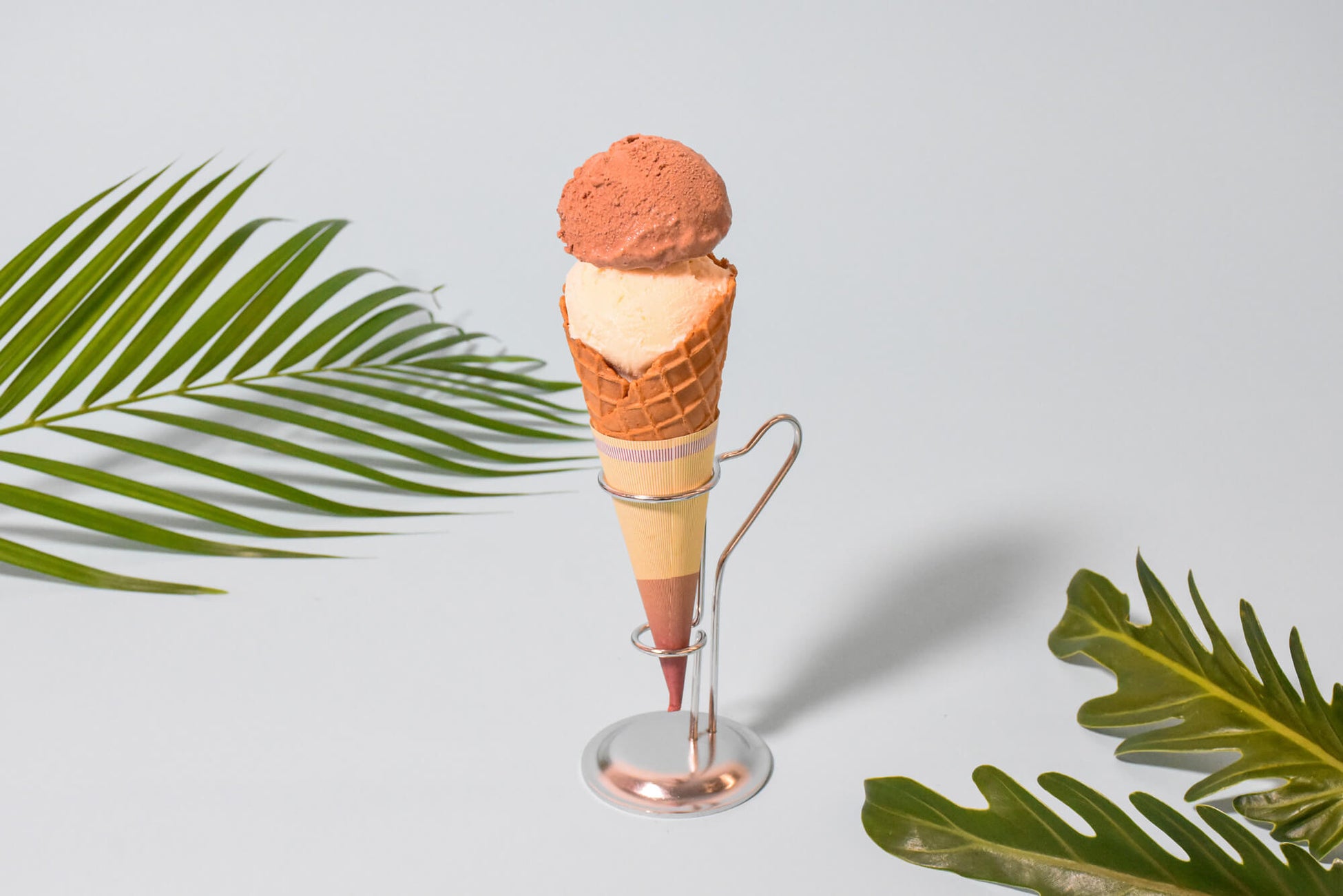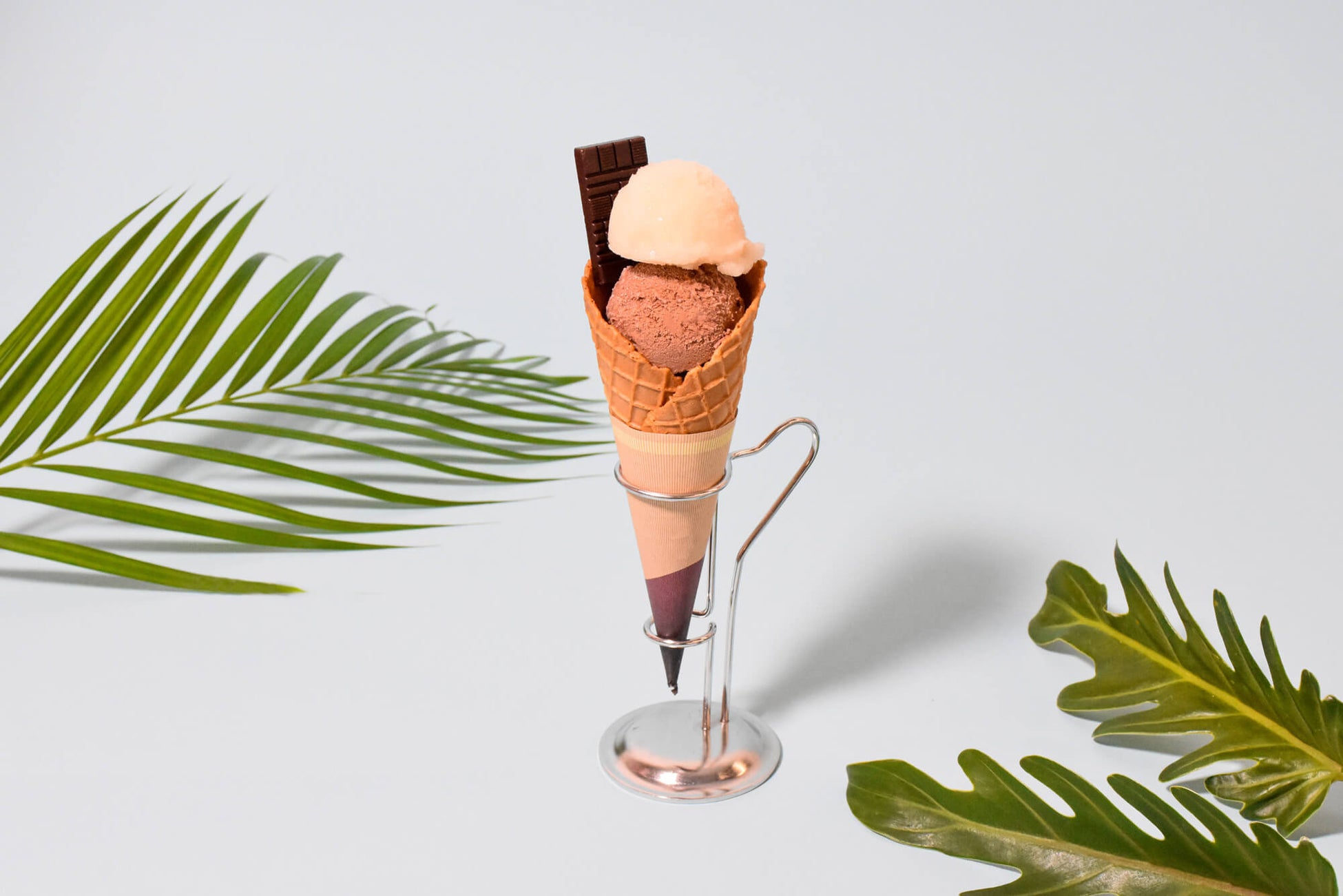 Patisserie Minimal 祖師ヶ谷大蔵店では、ホワイトチョコレートをローストした“ブロンドチョコレート”のアイスに、チョコレートアイスを重ねてご用意しました。