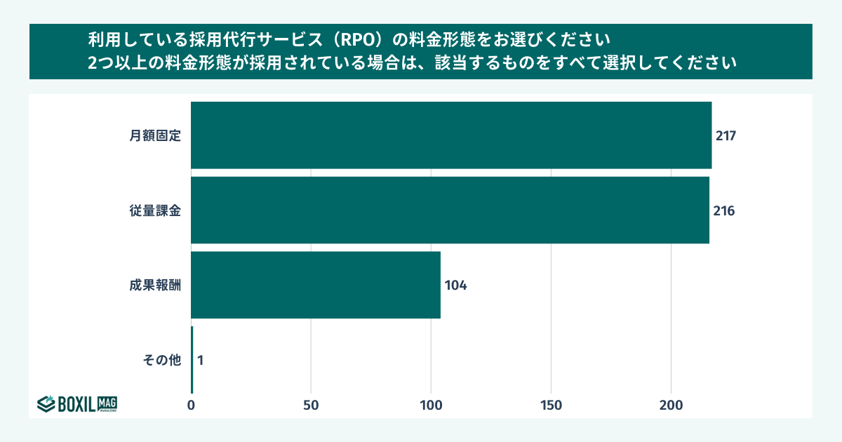 利用している採用代行サービス(RPO)の料金形態を複数回答可で尋ねたところ、最多の回答は月額固定(217人)でした。続く、従量課金(216人)がほぼ同数であることから、採用代行サービス(RPO)の料金形態は月額固定と従量課金の両方が主流と言えます。
