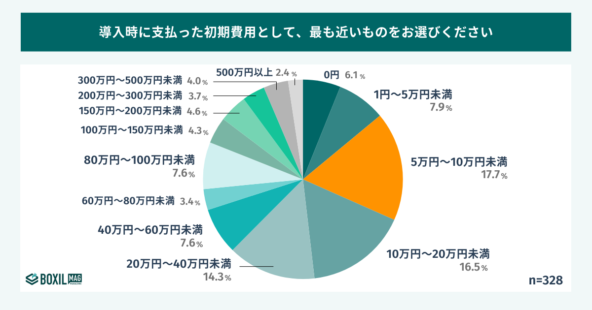 採用代行サービス(RPO)を導入する際にかかった初期費用の総額について尋ねたところ、最も回答が多かったのは「5万円~10万円未満」で17.7%でした。続く「10万円〜20万円未満(16.5%)」「20万円〜40万円未満(14.3%)」と合わせると、全体の48.5%を占めます。このことから、採用代行サービス(RPO)の初期費用の相場は5万円~40万円未満と言えます。