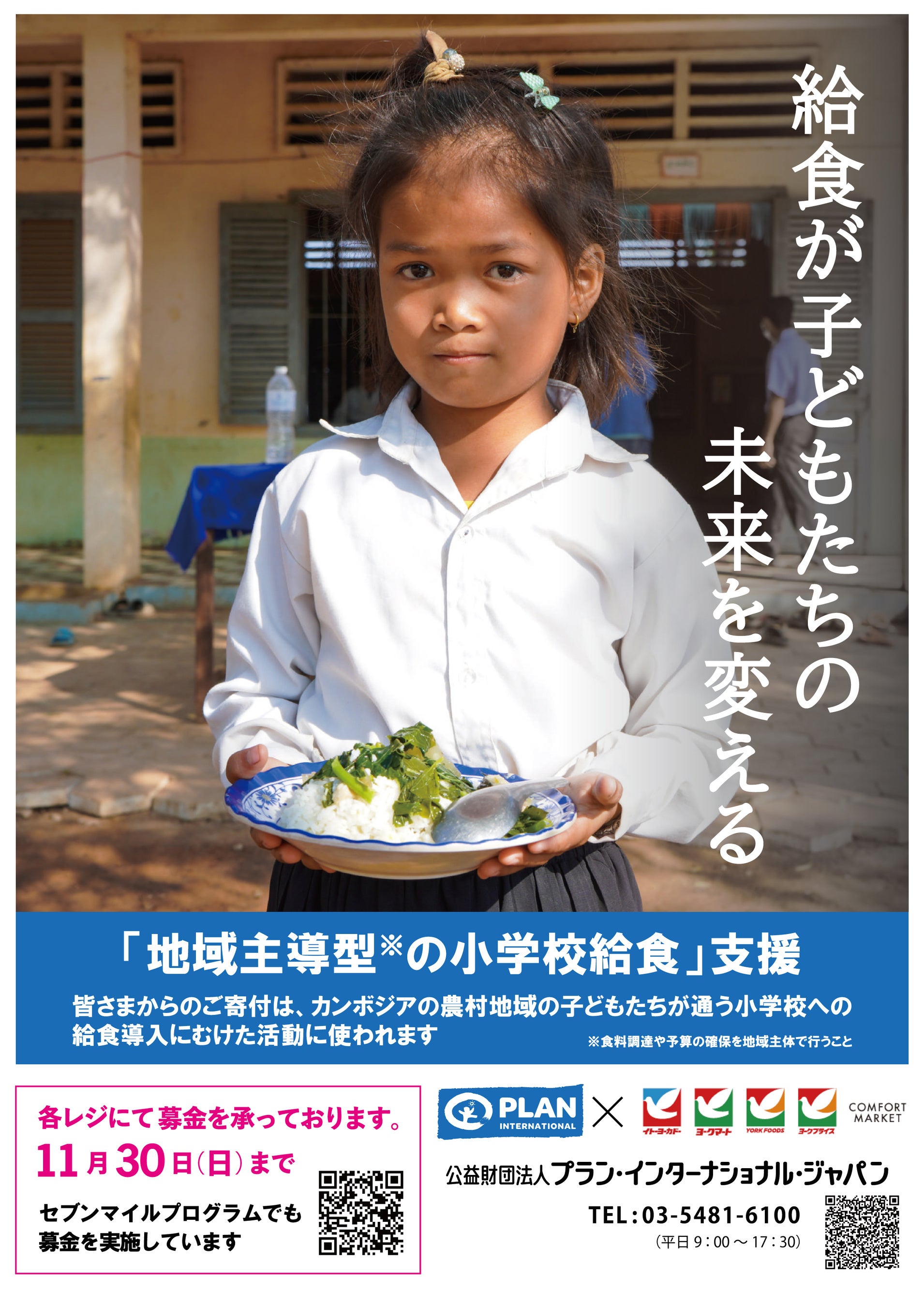 イトーヨーカ堂では、多様化する社会課題に対して、お客様や従業員とともに支援を行う取り組みを2016年から続けられています。今回は、2025 年 9 月 1 日(月)から約3カ月間、プランがカンボジアで実施している「地域主導型の小学校給食」プロジェクトの支援として、全国のイトーヨーカドー、ヨーク全店舗の募金箱および 「セブンマイルプログラム」において募金活動を展開し、合計で297万8,959円ものご支援が寄せられました。