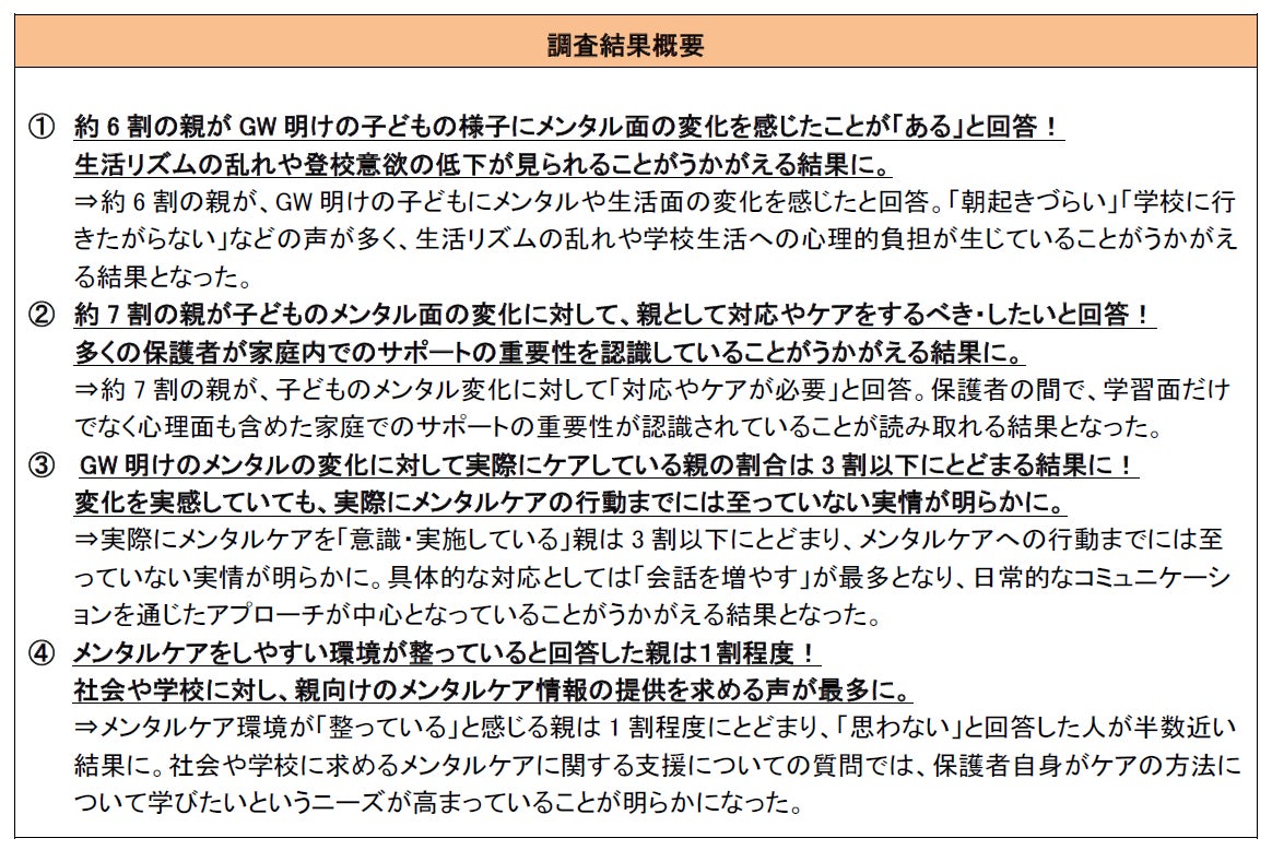 約6割の親がGW明けの子どもの様子にメンタル面の変化を感じたと回答!「GWのメンタル低下に関する意識調査」