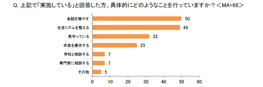 また、「実施している」と回答した人にその内容を尋ねたところ、「会話を増やす」(50)が最多となり、次いで「生活リズムを整える」(49)、「見守っている」(32)という結果になりました。各家庭では特別な対策よりも日常的なコミュニケーションを通じたアプローチが中心となっているものの、具体的なケア方法や対応の指針が十分に把握できていない可能性が示唆されました。
