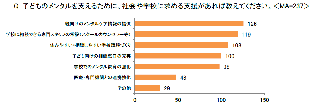 さらに、社会や学校に求める支援としては「親向けのメンタルケアに関する情報提供」(126)が最多となり、保護者自身がケアの方法について学びたいというニーズが高まっていることが明らかになりました。今後は、家庭任せにするのではなく、学校や社会全体で保護者を支える仕組みづくりが求められると考えられます。