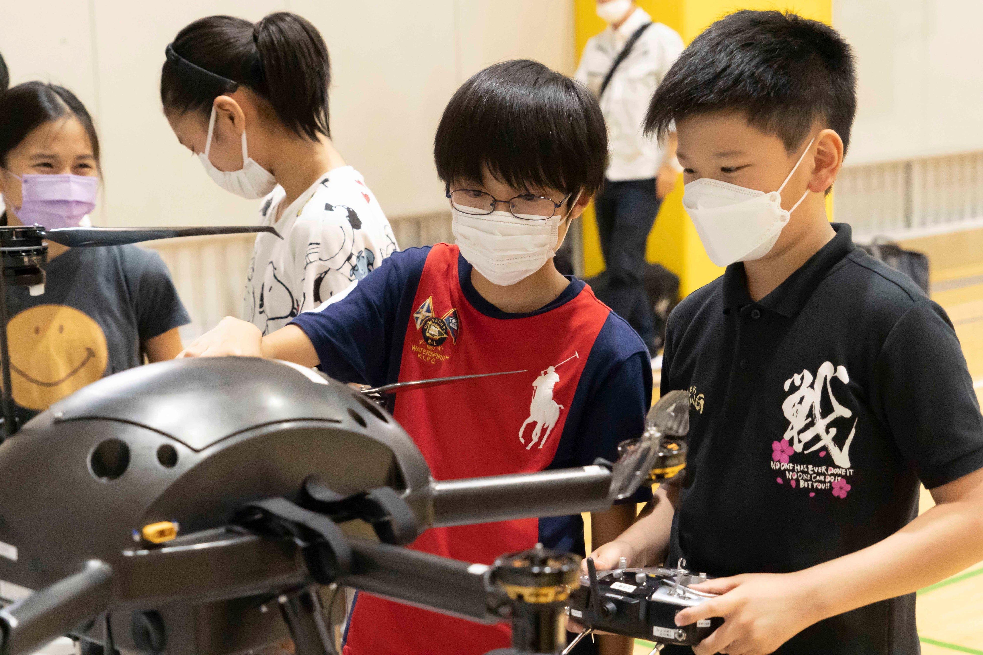 当日はデモンストレーションや児童がフライト体験をしたドローンの他、2機のドローンを展示し、児童たちにも直接機体に触れる時間を設けました。
