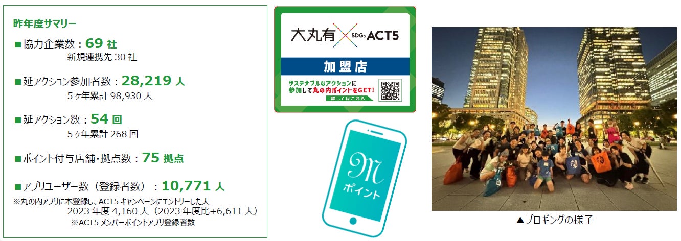 昨年度は、5月から約7ヵ月間のコア期間中に54件のアクションを展開、大丸有エリア内外の企業・団体約69社による協賛や協力のもと、延べ28,219名以上に参加いただき、アプリユーザー数(「丸の内ポイントアプリ」上でACT5キャンペーンにエントリーした人数)は1万人を超えました。なお大丸有SDGs ACT5が開始した2020年度から5ヶ年累計すると、延べ参加者数は98,930人となりました。