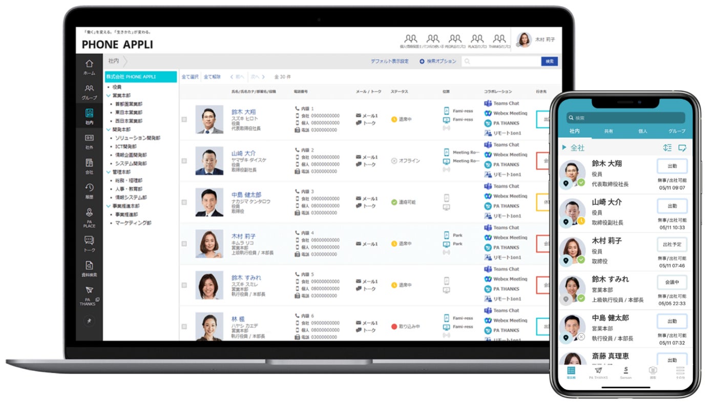 PHONE APPLI PEOPLEは、コミュニケーションを変え、風通しの良い組織をつくるコミュニケーションポータルです。名刺・Web電話帳の連絡先管理、人材・スキルの可視化、居場所表示、サンクスカードなど社内に浸透させたい様々なツールと連携し、集約することで利用ユーザーの導線や煩雑化しやすい複数ツールの管理環境をシンプルにします。そして、キーワードやスキルなどで社内の専門家を、名刺データからお客様や取引先を、それぞれ簡単に見つけだし、最適なツール(チャット、メール、電話、Web会議等)でコミュニケーションをとることができ、人と人のコラボレーションを活性化させます。この「シンプルな導線」と「人と人をつなげる情報」の集約により、お互いの強みや個性を知るきっかけを提供します。多様な働き方を実現する企業を支援し、組織を強化するコミュニケーションポータルとして、多くの企業様への支援実績を有しています。