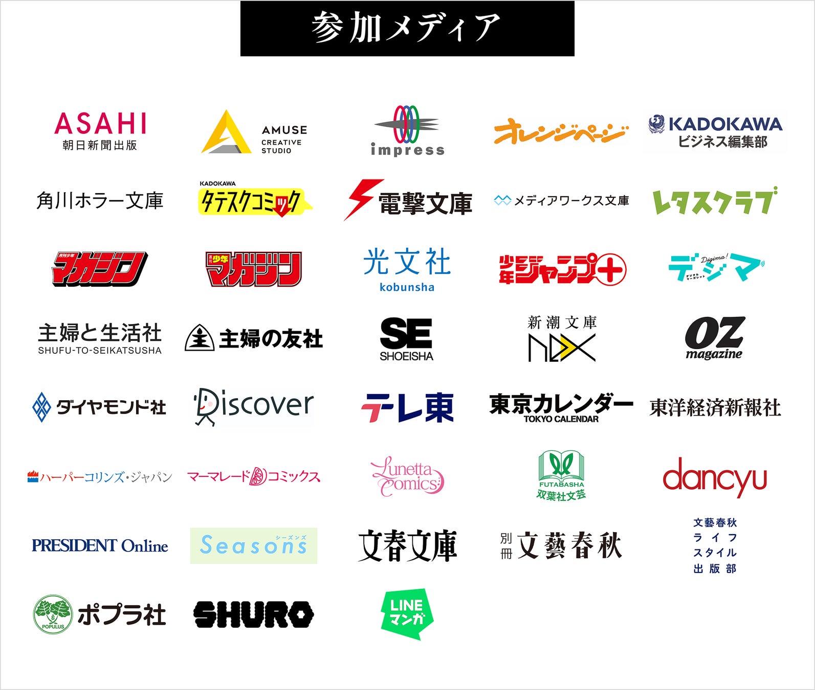 朝日新聞出版、アミューズクリエイティブスタジオ、インプレス、オレンジページ、KADOKAWAビジネス編集部(KADOKAWA)、角川ホラー文庫(KADOKAWA)、タテスクコミック編集部(KADOKAWA)、電撃文庫(KADOKAWA)、メディアワークス文庫(KADOKAWA)、レタスクラブ(KADOKAWA LifeDesign)、月刊少年マガジン編集部(講談社)、週刊少年マガジン編集部(講談社)、光文社、少年ジャンプ+編集部(集英社)、デジタルマーガレット編集部(集英社)、主婦と生活社 新事業開発編集部、主婦の友社、翔泳社、新潮文庫nex(新潮社)、OZmagazine/OZcomics/OZbooks(スターツ出版)、ダイヤモンド社、ディスカヴァー・トゥエンティワン、テレビ東京、東京カレンダー、東洋経済新報社、ハーパーコリンズ・ジャパン、マーマレードコミックス(ハーパーコリンズ・ジャパン)、ルネッタコミックス(ハーパーコリンズ・ジャパン)、双葉社文芸出版部、dancyu(プレジデント社)、プレジデントオンライン(プレジデント社)、文藝春秋コミック編集部(文藝春秋)、文春文庫(文藝春秋)、別冊文藝春秋(文藝春秋)、ライフスタイル出版部(文藝春秋)、ポプラ社文芸編集部、SHURO/異世界のSHURO(マガジンハウス)、LINEマンガ(LINE Digital Frontier)