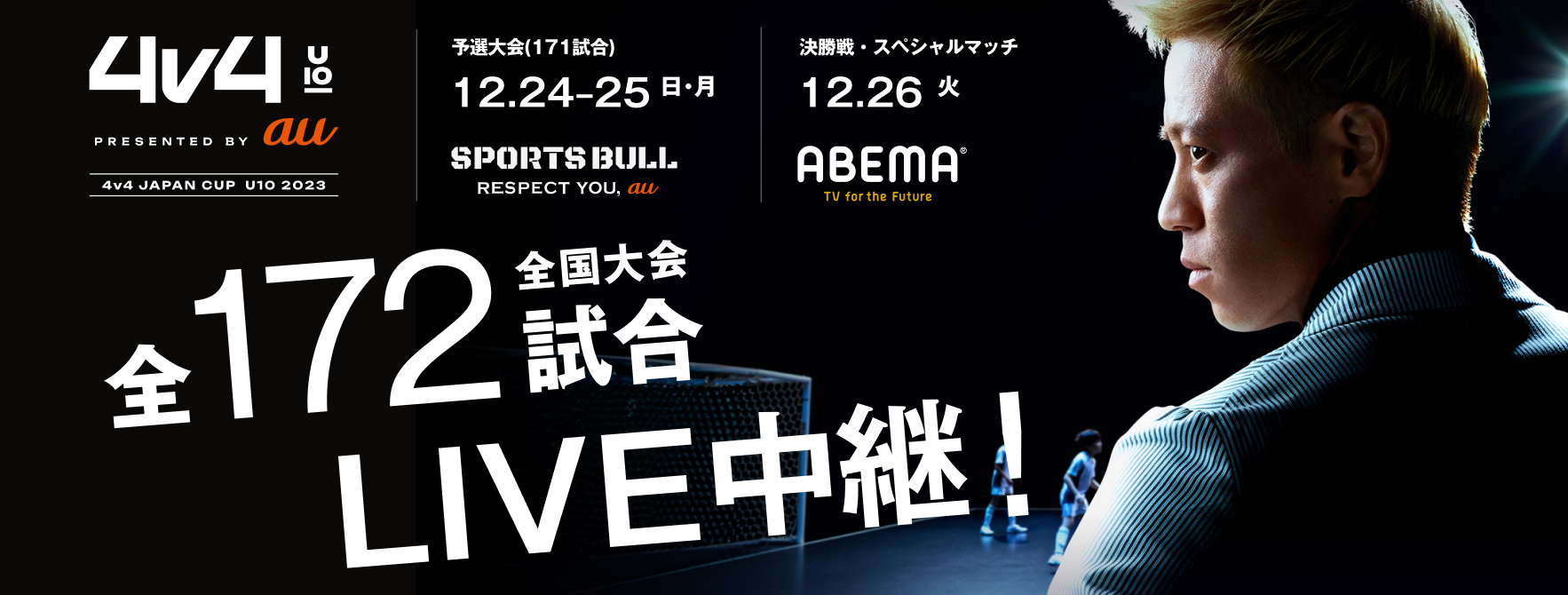 本田圭佑が考案した4対4の10歳以下のサッカー全国大会の全【172試合】をLIVE中継決定!12月24・25日の予選大会は「SPORTS BULL」で、12月26日の決勝大会は「ABEMA」で放送。