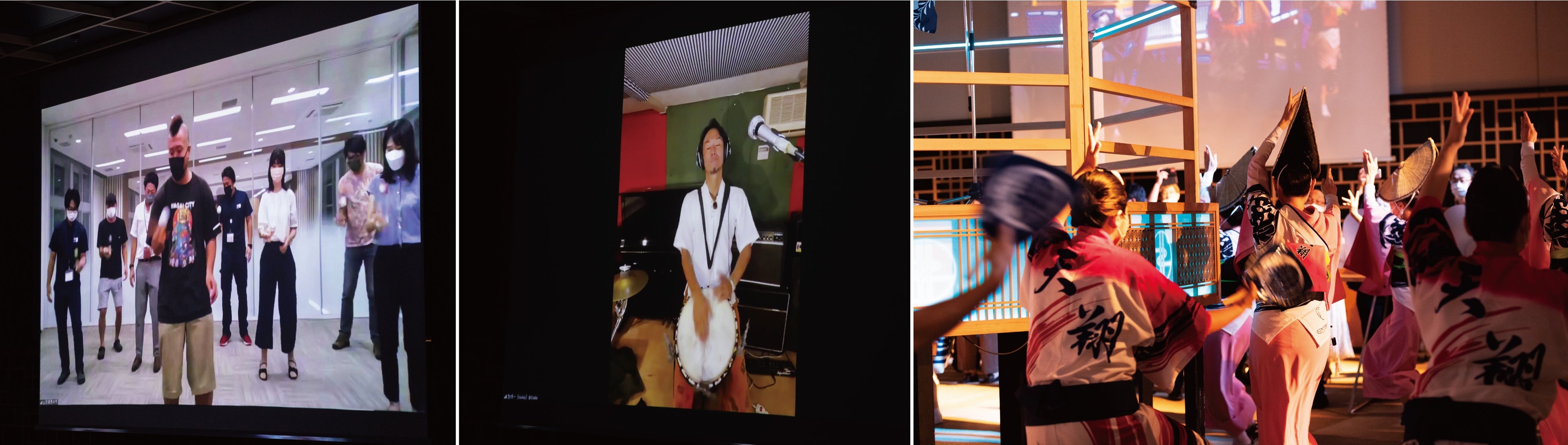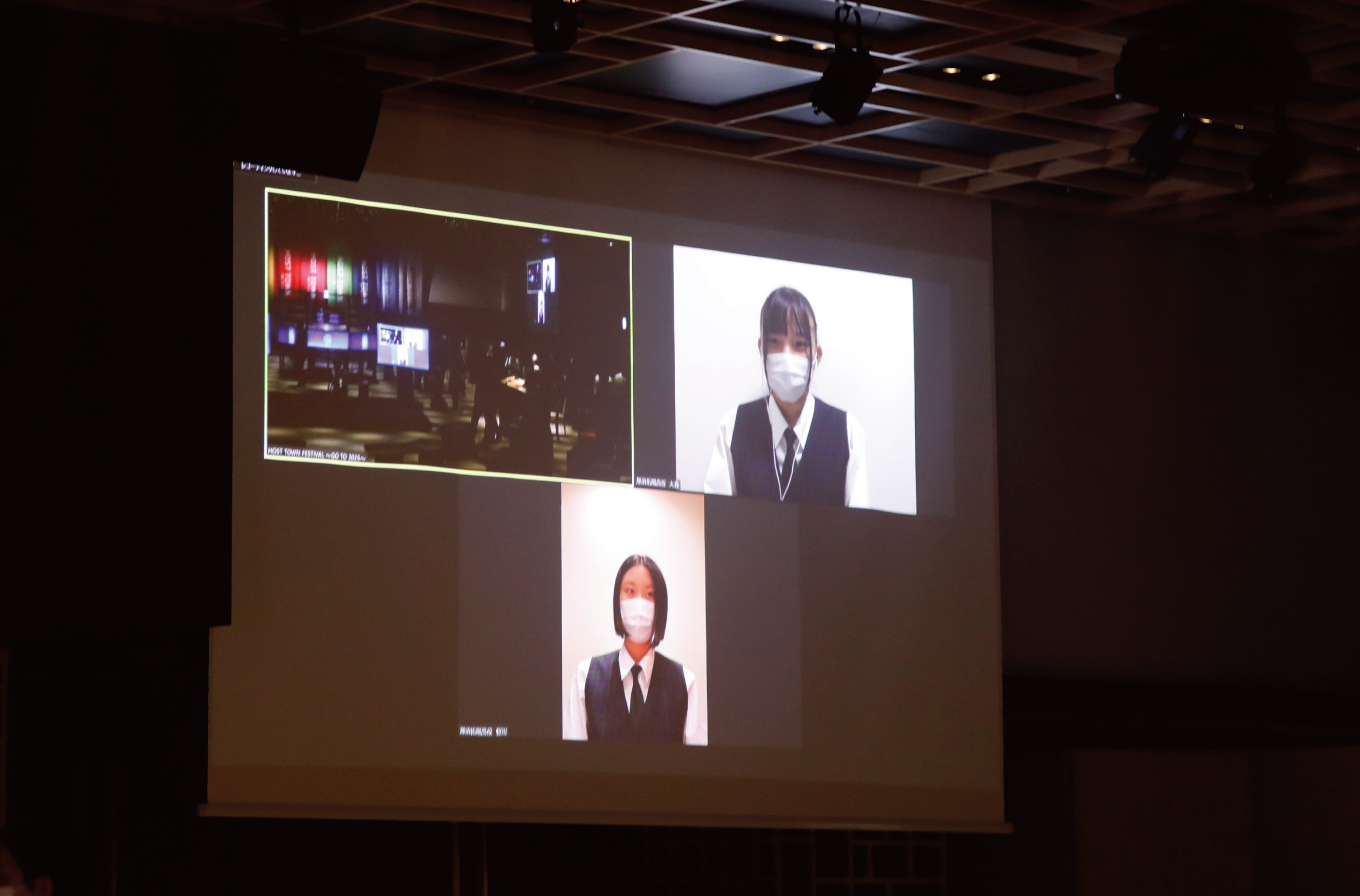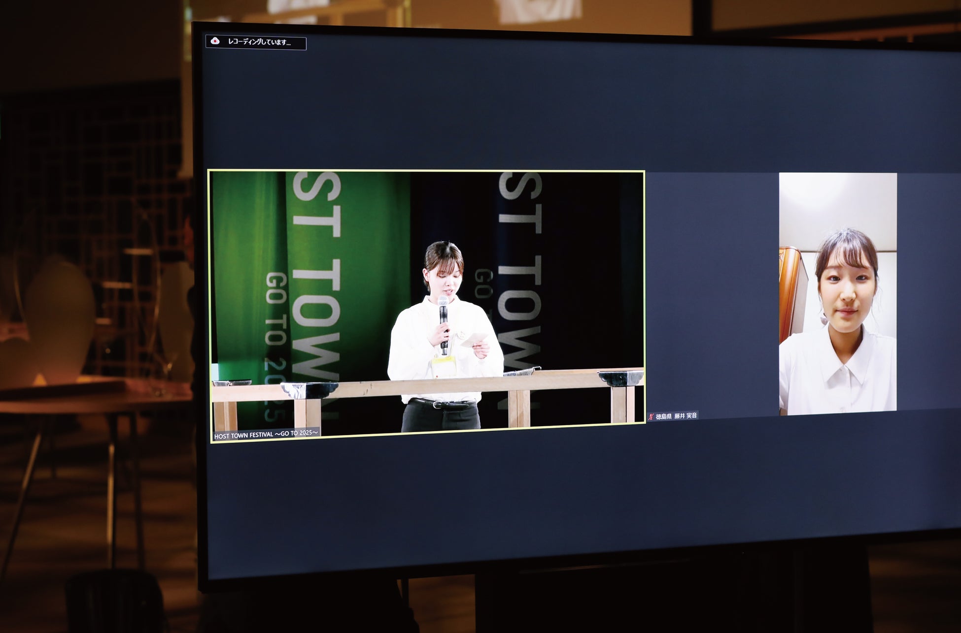続いて中継は徳島商業高校ビジネス研究部に切り替わり、相手国ジョージアの国歌を歌うことで得られたアスリートと県民との絆や、聖火ランナーとして区間の最後を走った思い出などを披露。最後はアスリートに「いつもと同じパフォーマンスを出してほしい」との願いから手がけた徳島県産素材でつくったジョージア料理に触れ、会場へバトンをつなぎました。