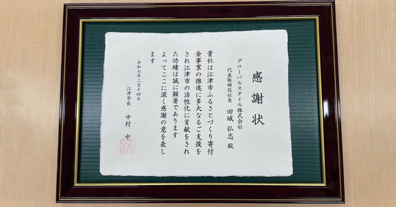 オーダースーツ専門店「グローバルスタイル」を運営するグローバルスタイル株式会社(東京証券取引所 スタンダード市場:7126、本社:大阪市中央区、代表取締役社長 田城弘志)は、ふるさとづくり寄付金事業の推進による地域活性化への貢献が認められ、このたび島根県江津市(市長:中村中)より感謝状を受領しました。