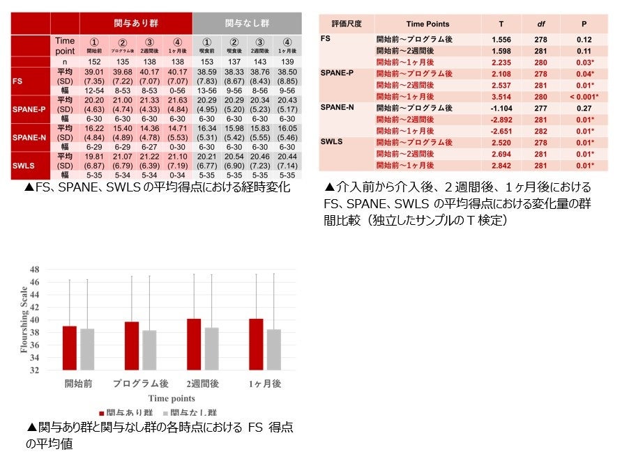 主要評価項目には心理的ウェルビーイングを測定する「Flourishing Scale(以下FS)」を、副次評価項目には主観的ウェルビーイングを測定する「Scale of Positive and Negative Experience(以下SPANE)」「Satisfaction With Life Scale(以下SWLS)」を使用し、主観評価により得られた結果を統計学的に解析しました。
