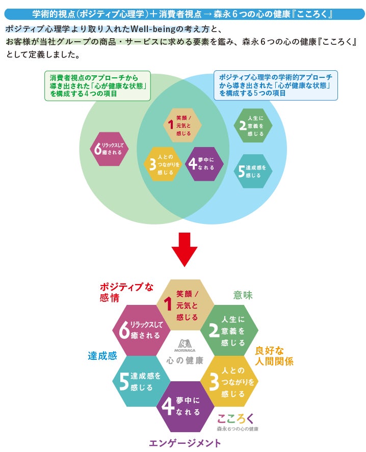 「学術的視点(ポジティブ心理学)」+「消費者視点」 →森永6つの心の健康『こころく』