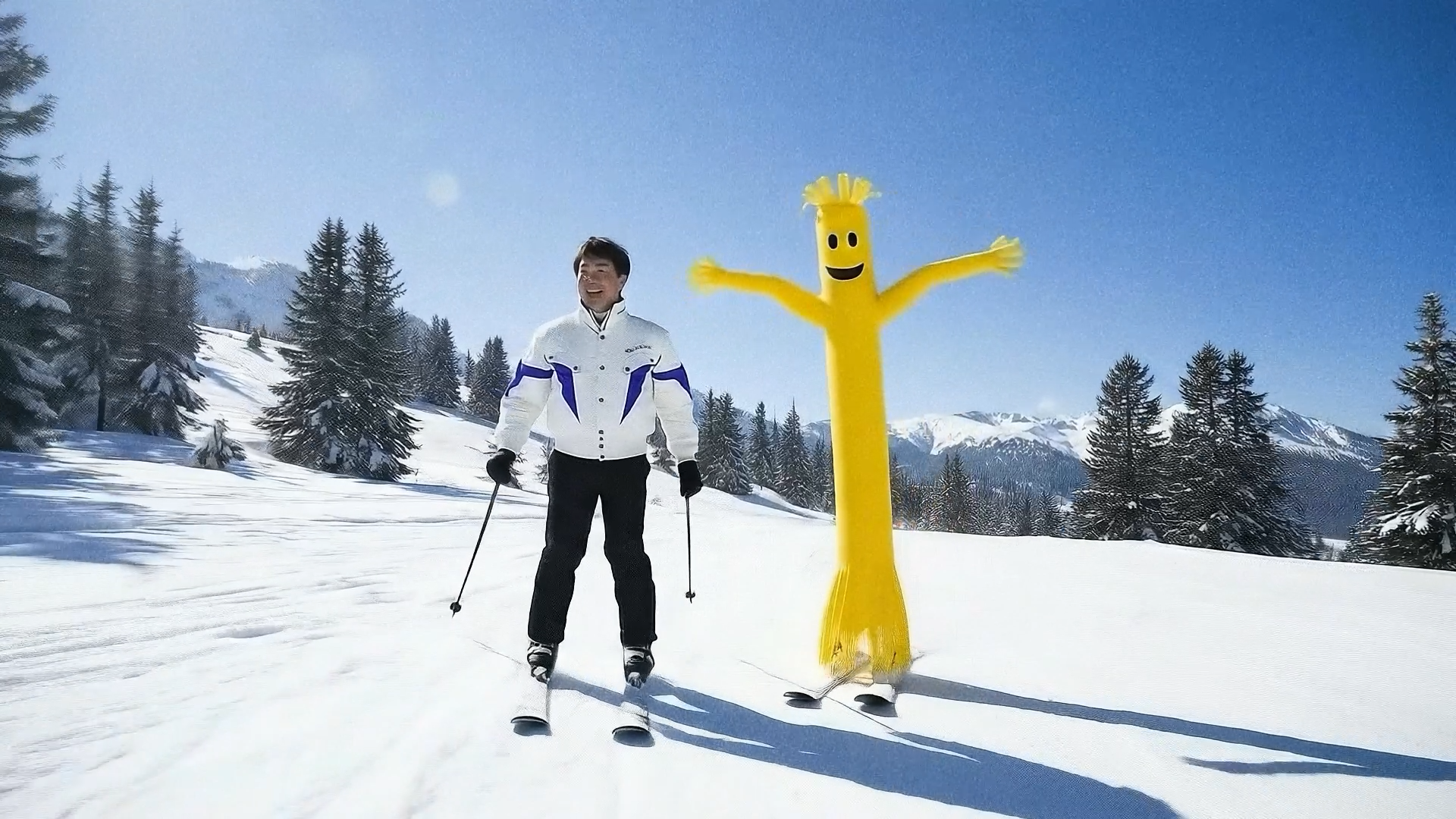 AIによる拡張:オリジナルの「爽快感」というテーマを、空を飛ぶ「チューブマン」の視点へと拡張。AI動画生成モデル「Veo」を活用し、チューブマンが世界中の空を飛び回り、スキー場へダイナミックに舞い降りるなど、現実の撮影では不可能なアングルと浮遊感のある映像美を実現しました。