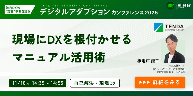 マニュアルトータルソリューションを軸に「ホワイトカラーの業務効率化」を推進する株式会社 テンダ(本社/東京都渋谷区、代表取締役会長兼社長 CEO/薗部 晃、以下「テンダ」)は、クラウド サーカス株式会社(本社/東京都新宿区、代表取締役社長/金井 章浩)主催のオンラインイベント 『デジタルアダプションカンファレンス 2025 ~AI・DX ソリューション導入のその先にある“定着 化”のリアルと実践録 15 選~』 (11 月 18 日開催)に登壇いたします。本セミナーでは、社内 DX 推進における「導入後の活用・定着(デジタルアダプション)」に焦点を当て、AI 活用から RPA 文化 醸成、セキュリティ運用まで 15 社の最新事例と具体策を共有し、参加者の業務効率化と成果創出を支援します。