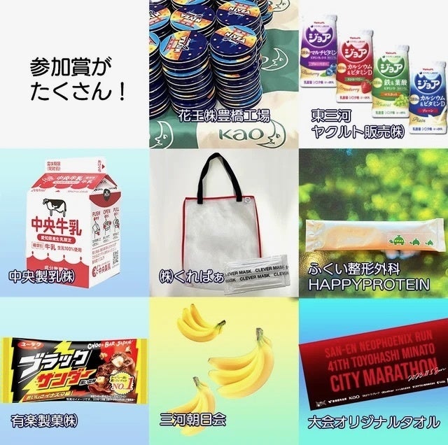 『みんなで楽しんで走り、支える市民マラソン』をコンセプトとしており、地域の多くの企業・団体にささえられているため、参加賞や副賞等が充実しています。