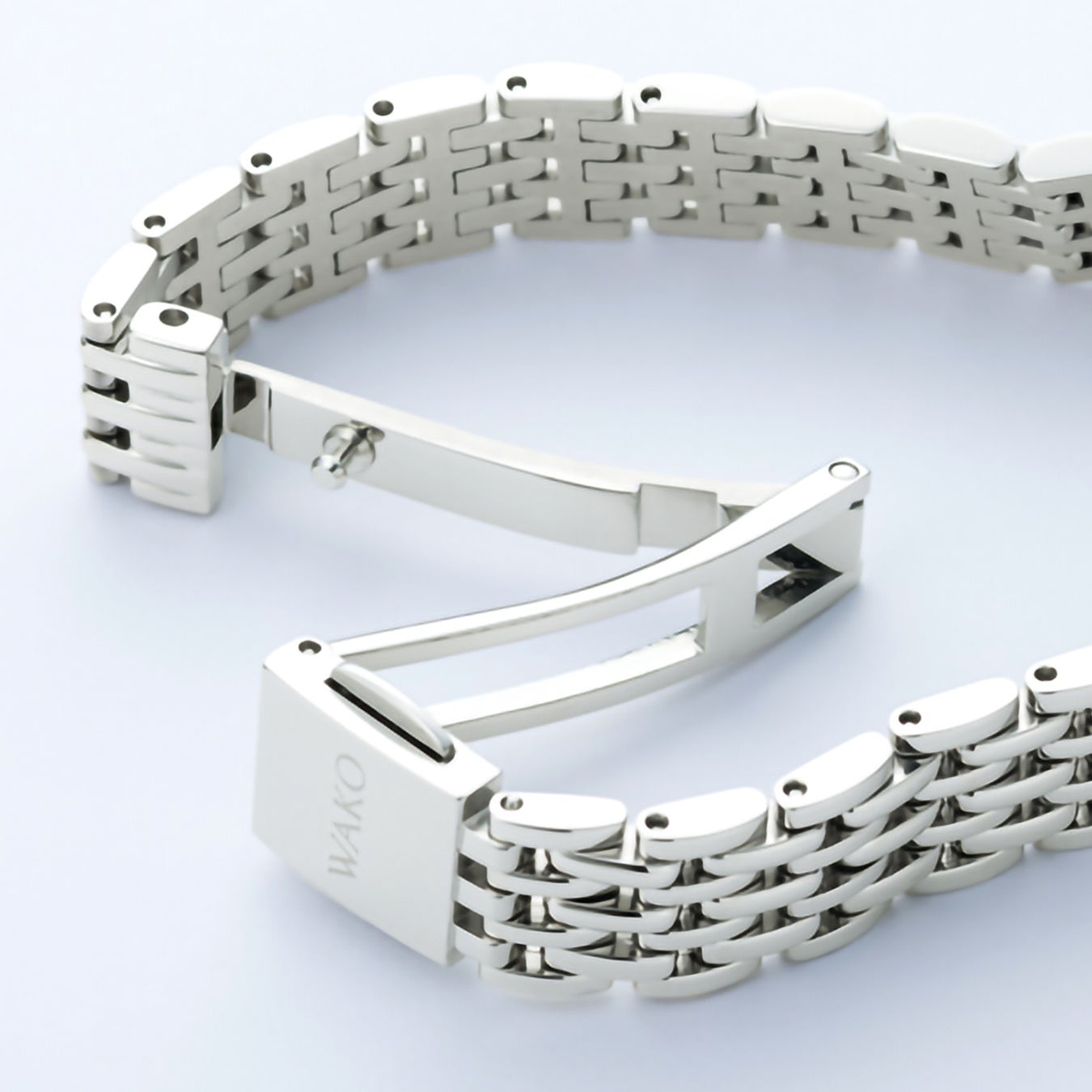 ピッチが細かい駒で構成したブレスレットはしなやかで手首に沿う優しい着け心地を実現しました。中留は片手で着脱可能なプッシュ式三つ折れ方式を採用し、エレガントなデザインと実用性を兼ね備えたモデルに仕上げています。