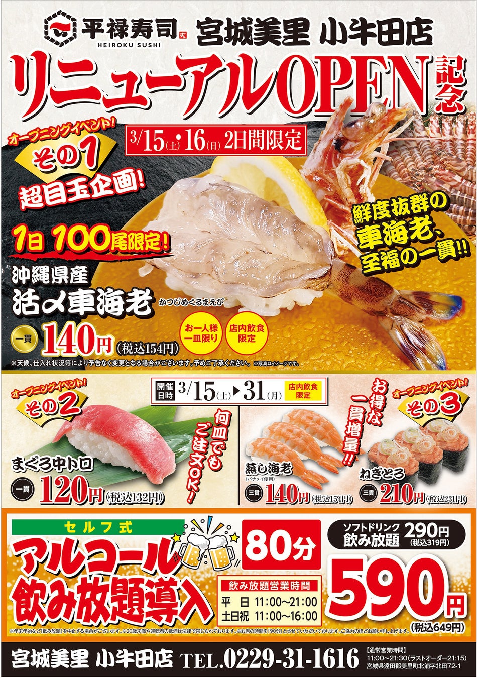 1967年創業以来、回転寿司のパイオニアとして1貫1貫、手握りのお寿司を提供し続けてきた「平禄寿司」では3月15日(土)に「宮城美里 小牛田店」をリニューアルオープンいたします。そして、お客様にはリニューアルオープン特典をご用意いたしました。15日(土)、16日(日)限定にて両日先着100尾限定で「活〆車海老」を154円(税込)で提供(詳細は別記)。3月31日(月)まで、まぐろ中トロを特別価格、蒸し海老、ねぎとろを一貫増量の三貫にて提供いたします。また、セルフ式「アルコール飲み放題」も新しく導入いたします。どうぞご利用ください。スタッフ一同、皆さまのご来店をお待ちしております。