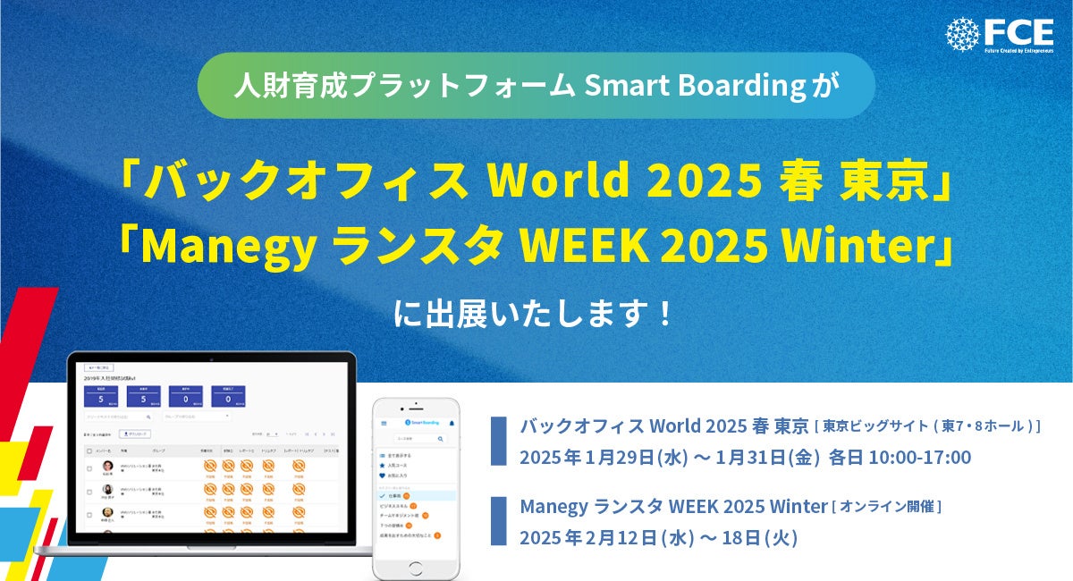 人財育成プラットフォーム「Smart Boarding」(スマートボーディング)(https://www.smartboarding.net/)を提供する株式会社FCE(本社:東京都新宿区、代表取締役:石川淳悦、東証9564)は、2025年1月29(水)~31日(金)の3日間、東京ビッグサイトにて開催されます「 バックオフィス World 2025 春 東京 」、2025年2月12日(水)~18日(火)にて、オンライン開催されます「 Manegy ランスタWEEK 2025 Winter 」に出展いたします。