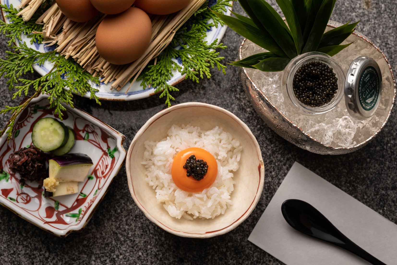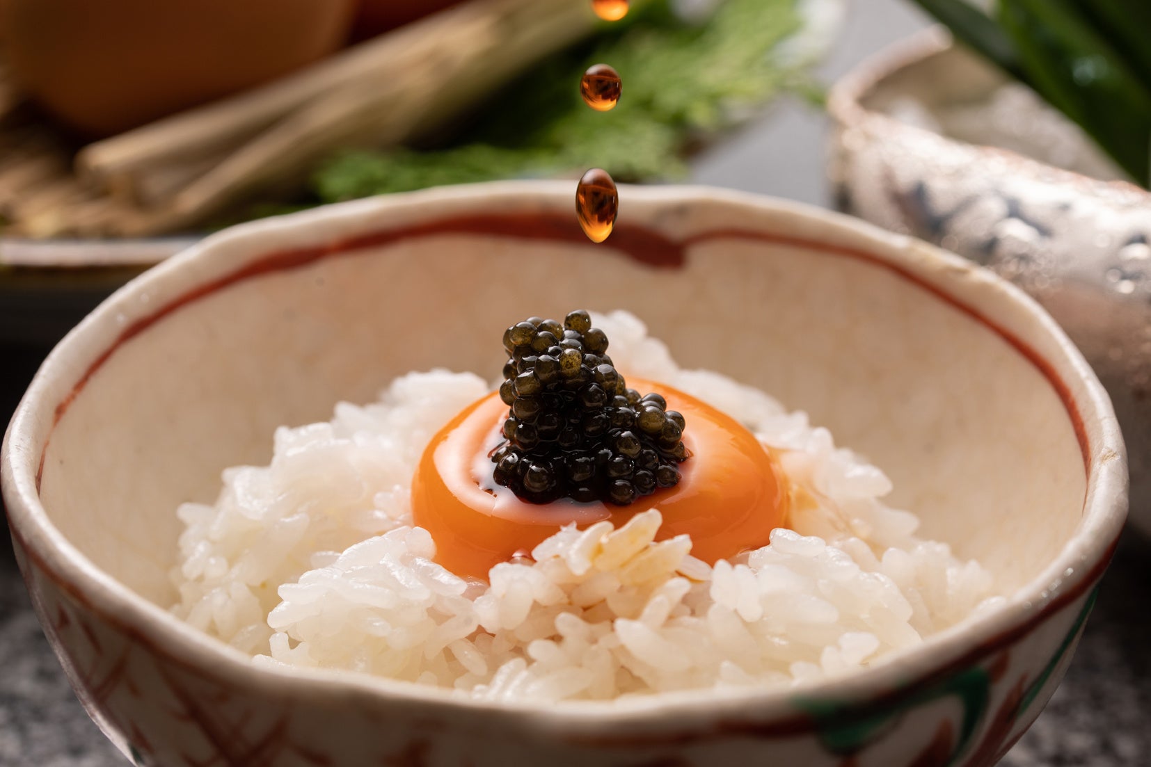 海と山の最高級の卵の競演をお楽しみいただけるTKG(卵かけご飯)をご用意しております。まず、釜炊きのご飯と京都から取り寄せているこだわりの濃厚卵だけで甘みとコクをお楽しみいただきます。そして、その上にもう一つの「卵」、塩味の少ない国産のキャビアを合わせてご堪能ください。ひと瓶まるごとお付けするまろやかでクリーミーな味わいが特徴のキャビアは、口の中に入れるとふわっととろける舌ざわりです。料理長の特製出汁醤油の旨味が合わさるグランド ハイアット 東京でしか味わうことのできないTKGです。お食事とともに、お酒を楽しんだ後の〆の一品としてもおすすめです。