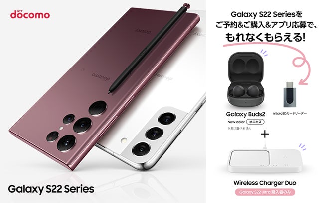 また、2022年4月7日(木)からのキャンペーン期間中に「Galaxy S22」または「Galaxy S22 Ultra」をご予約・ご購入・ご応募いただいたお客様全員に、純正ワイヤレスイヤホン「Galaxy Buds2」と「microSDカードリーダー」をプレゼントするキャンペーンを実施いたします。「Galaxy S22 Ultra」をご予約・ご購入・ご応募いただいたお客様には、さらに「Wireless Charger Duo」もプレゼントいたします。