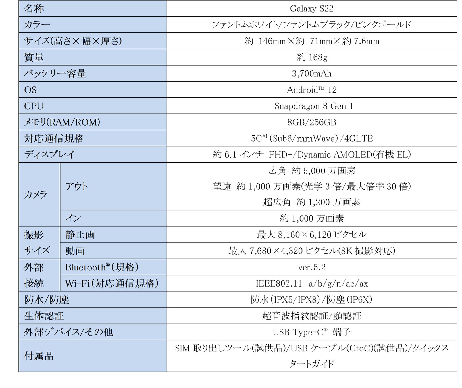 <「Galaxy S22」の主な仕様>
