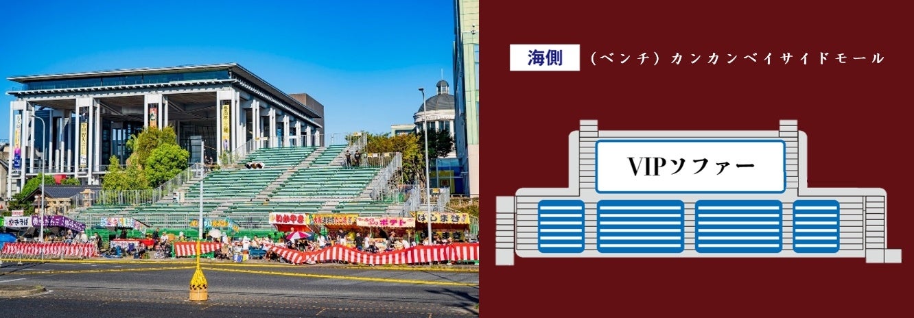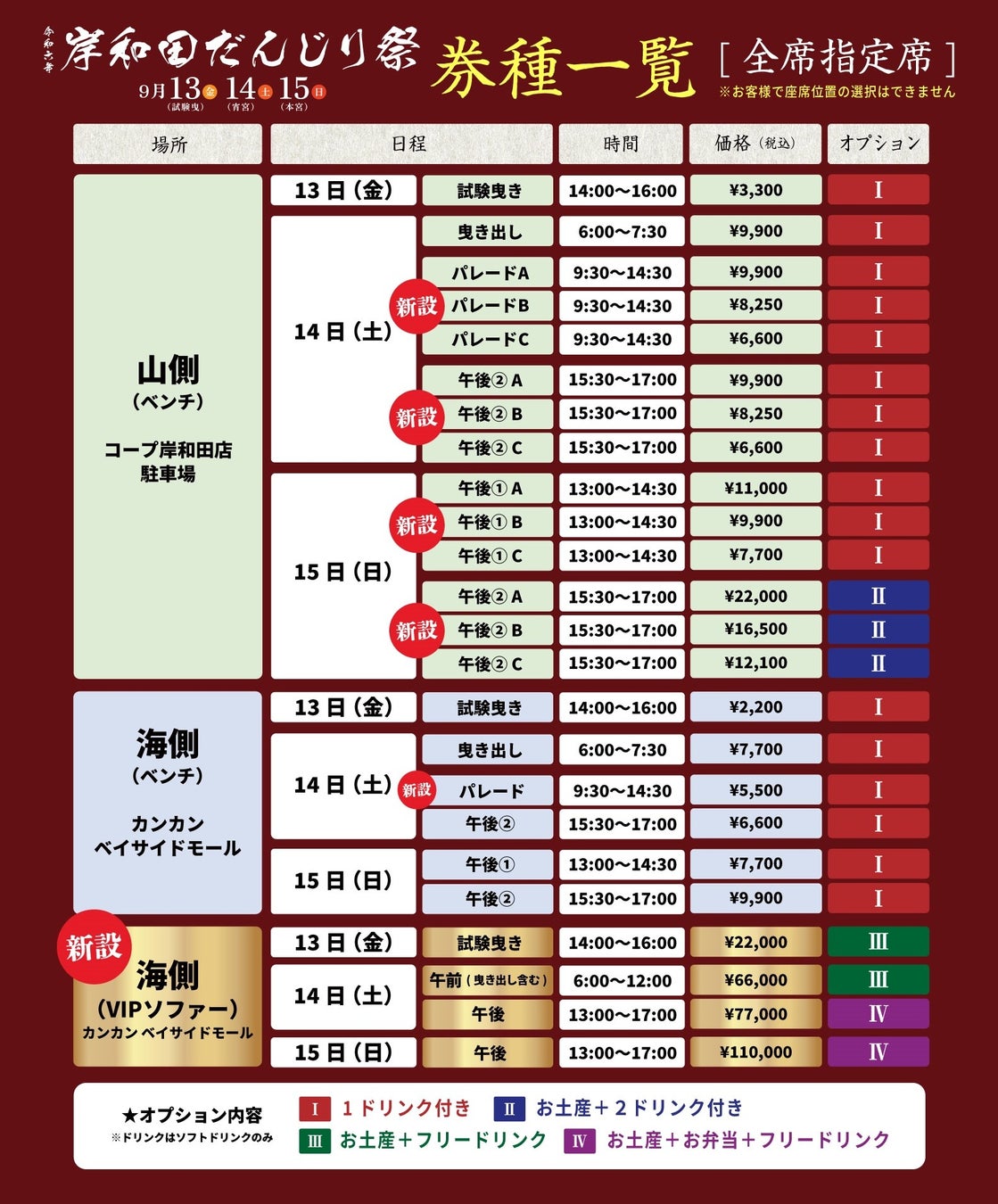 9月13日(金)から15日(日)までの3日間(試験曳き、宵宮、本宮)、「カンカン場」に面する山側(コープ岸和田店駐車場)と海側(カンカンベイサイドモール)の2会場にて、特設ビューイングシートを設置します。本番前日ならではの緊張感を間近で味わえる「試験曳き」、本番当日にだんじりが各町に繰り出す決定的な瞬間が観られる「曳き出し」、全だんじりが一挙に集結する「パレード」、そして祭りの盛り上がりが増す「午後」の時間帯まで、バリエーション豊かな席種をご用意!今年は昨年の参加者のご要望に応え、山側の一部時間帯をA,B,Cの3つのエリアに分けて販売し、海側には新たにソファーVIP席を設置します。また、熱中症対策のため、全席種ソフトドリンク付きでのご案内を予定しております。毎年大混雑必至の岸和田だんじり祭を、特別観覧席でゆったりとお楽しみください。