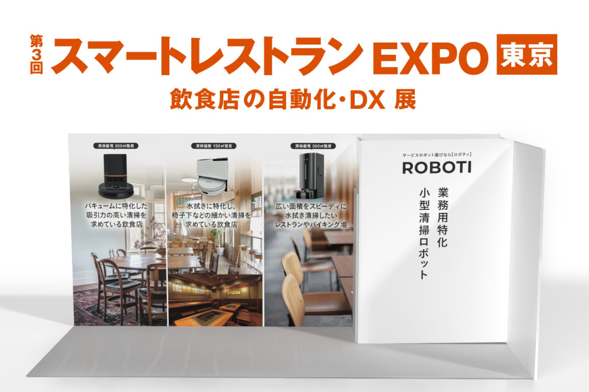 「スマートレストランEXPO」とは、飲食店における人手不足、自動化・業務効率化などの課題を解決するための調理ロボット、AI、POS、モバイルオーダー、集客支援などの製品・サービスが一堂に集結する専門展です。当社は今回、飲食店・レストランの人手不足を解決する業務用小型清掃ロボットブランド「ROBOTI(ロボティ)」を出展します。