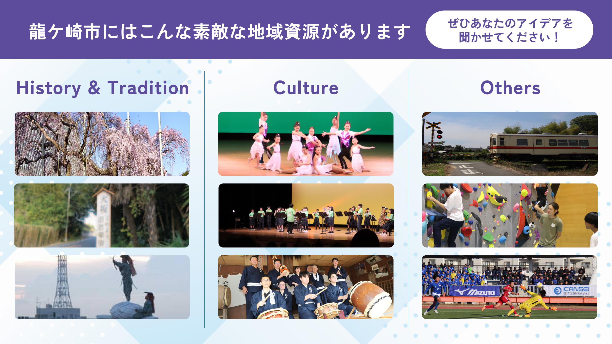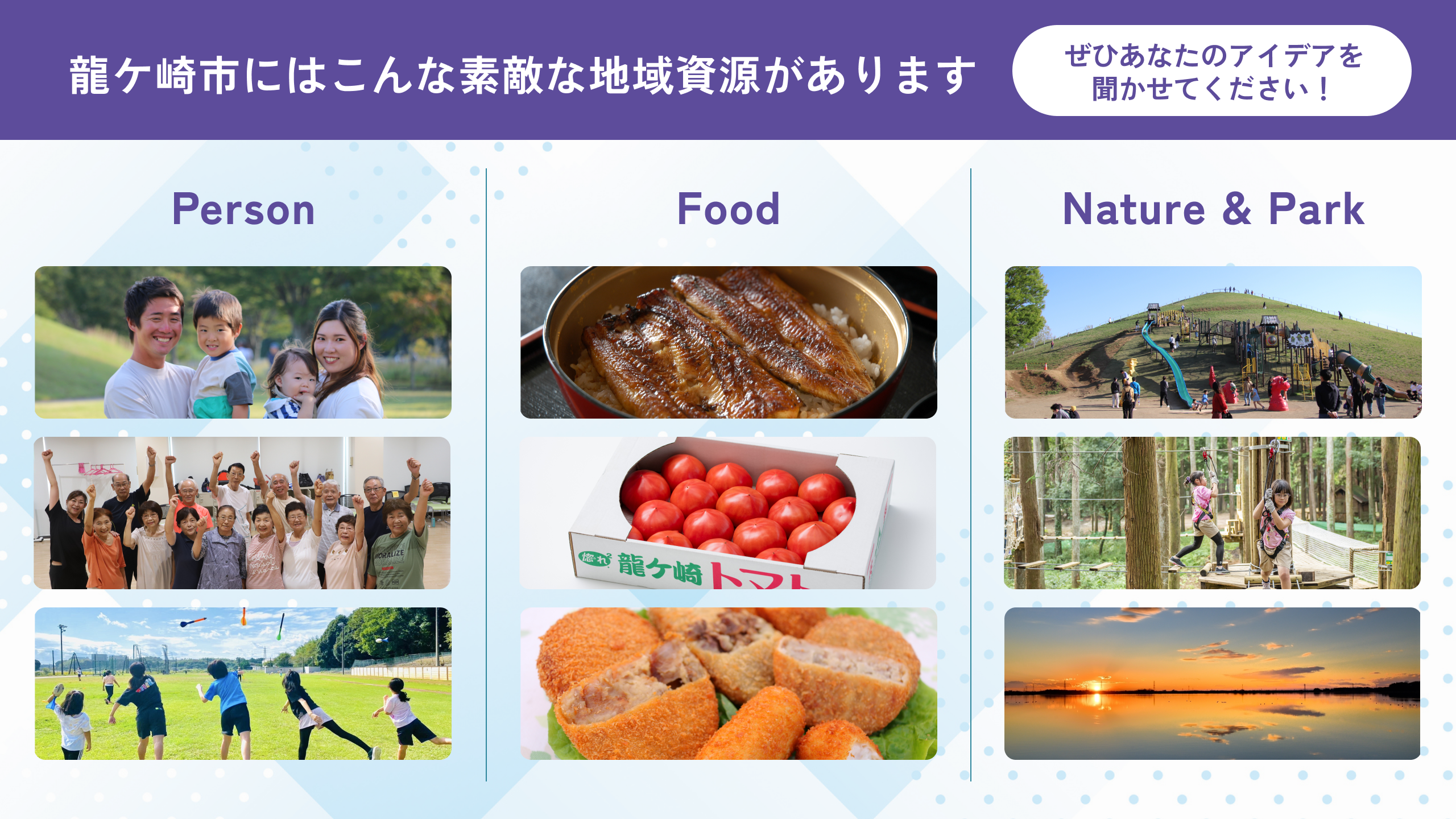 茨城県龍ケ崎市では、身近な「地域資源」を活かし、まちの魅力とにぎわいを高めていく取組を進めています。もっとワクワクする「活気あるまち」を目指すため、地域資源の活用アイデアを市民の皆さんから募集します。