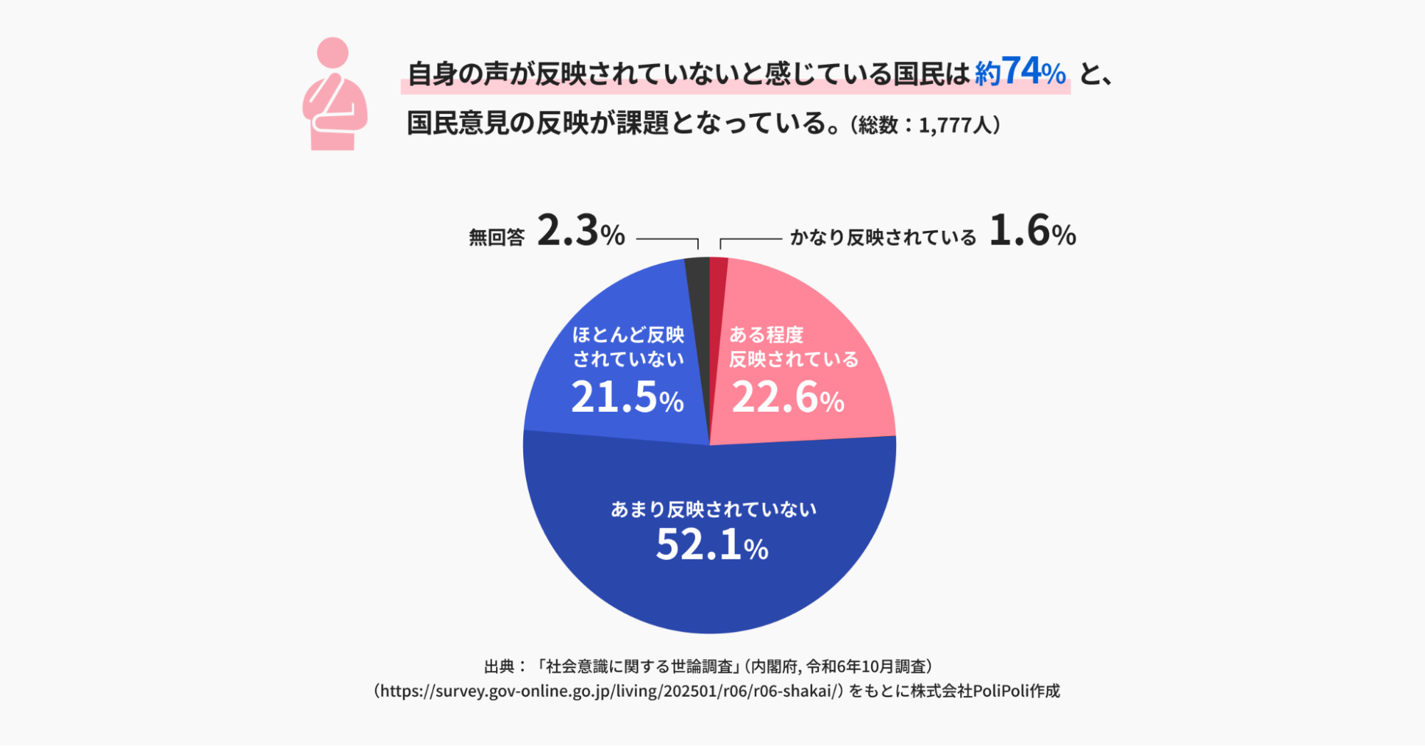 日本は自らの意見が社会に反映されていないと感じる国民が7割以上と高い水準になっています。この課題を解決するためには、誰でも気軽に行政との仕組みづくりに参加できるツールが必要です。サービス提供を通じて、住民と行政が共に政策を創る「政策共創」ができる社会を目指しています。