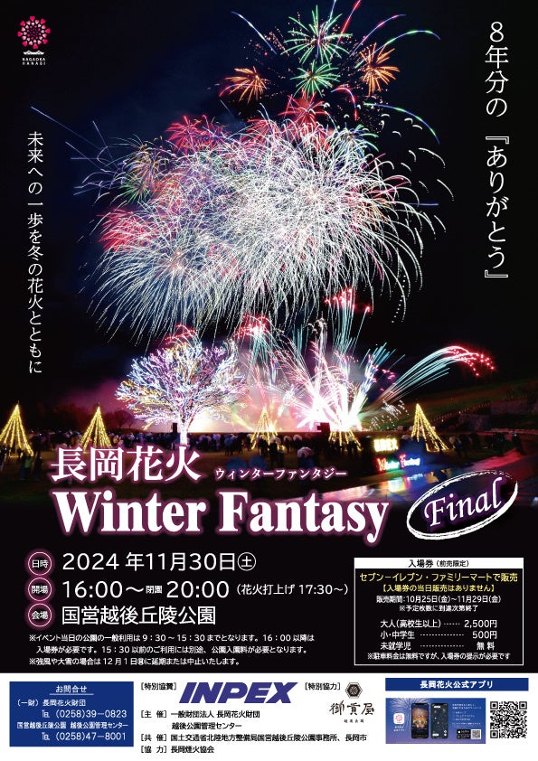 国営越後丘陵公園(新潟県長岡市)では、11月30日(土)に長岡花火ウインターファンタジーFinalを開催します。