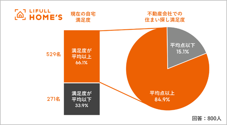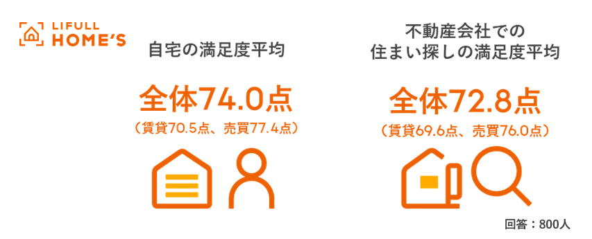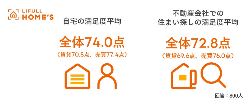 - 現在居住中の自宅の満足度は「平均74.0点」。不動産会社での住まい探しの満足度は「平均72.8点」。自宅の満足度が高い人でも、15%の人が住まい探しに不満を感じていた。