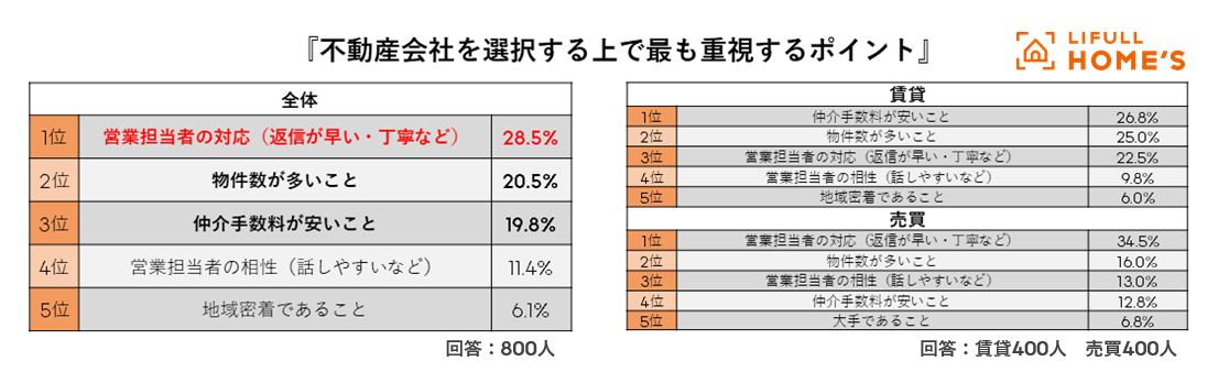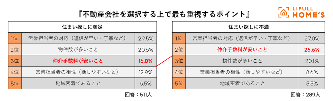 - 不動産会社を選択する上で最も重視するポイントTOP3は、「営業担当者の対応」「物件数の多さ」「仲介手数料の安さ」。「仲介手数料の安さ」を重視すると、住まい探しに不満が残る傾向に。