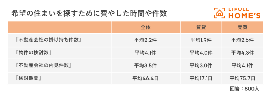 - 住まい探しでの不動産会社の掛け持ち件数は「平均2.2件」、物件の検討数は「平均4.1件」、物件の内見件数は「平均3.5件」。検討期間は「平均46.4日」、賃貸・売買で差があり、賃貸「平均17.1日」、売買「平均75.7日」。