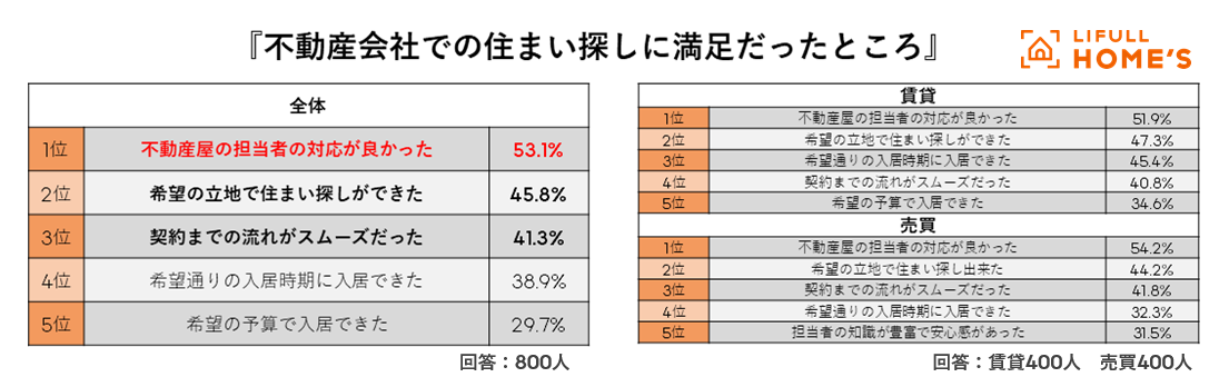 住まい探しに満足した人に『不動産会社での住まい探しに満足だったところ』を尋ねたところ、第1位「不動産会社の担当者の対応が良かった」が53.1%に。第2位「希望の立地で住まい探しできた(45.8%)」、第3位「契約までの流れがスムーズだった(41.3%)」が続きました。