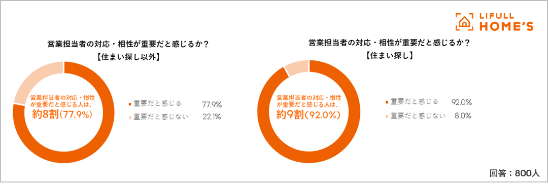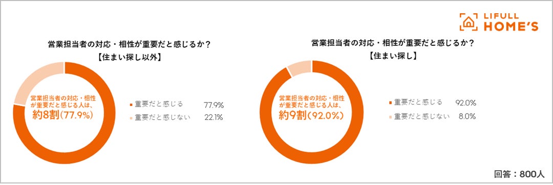 - 買い物の際、営業担当者の対応・相性が重要だと感じる人は約8割。住まい探しでは9割に。