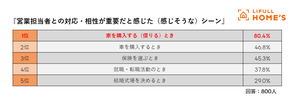 『営業担当者との対応・相性が重要だと感じた(感じそうな)シーン』を尋ねたところ、TOP3は「家を購入する(借りる)とき(80.4%)」、「車を購入するとき(46.8%)」、「保険を選ぶとき(45.3%)」という結果となり、大きな買い物をする際は営業担当者との対応や相性を重要と感じている傾向にあることが分かりました。